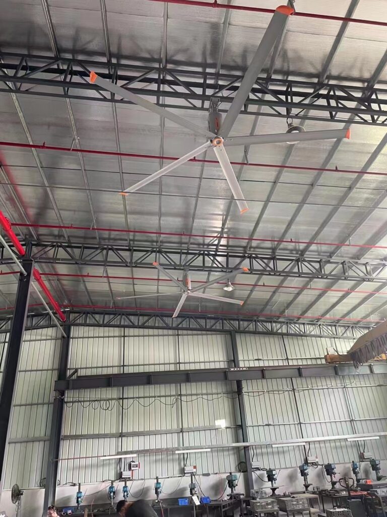 The HVLS fans facilitate natural ventilation by increasing air circulation in open or semi-open workshops to minimize the use of mechanical cooling. This is consistent with the LEED Sustainable Sites credits and BREEM Pollution category, which reward low-carbon plans. The low power consumption of fans (below 1.5 kW) reduces the effect on the environment compared to the 50-200 kW of HVAC of the same size.