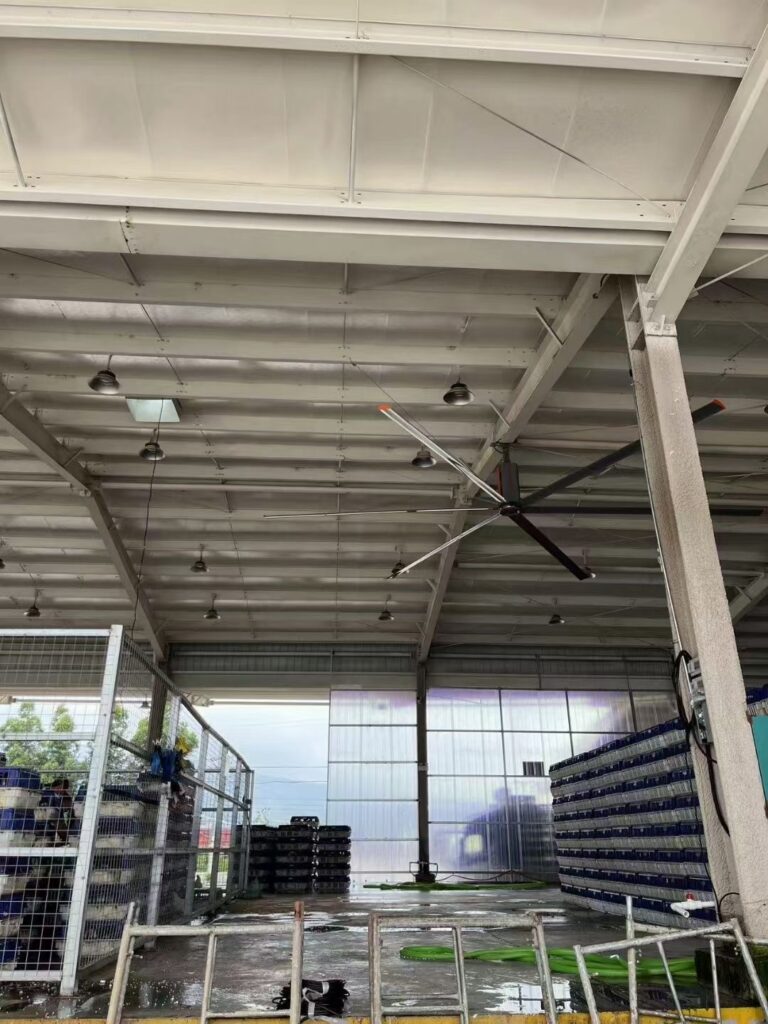Existing ceiling fans, 8-24 feet in diameter, pass a range of 400,000 cubic feet per minute at low speeds (50-100 RPM), providing high-power cooling solutions to factories that are eco-friendly.